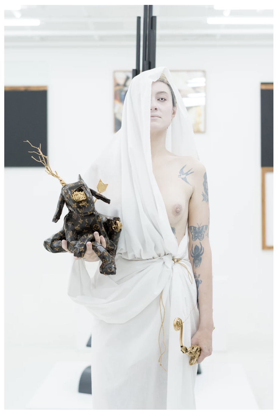 proporcional de acúmulos histórico-teóricos, se constitui, entre uma miríade de técnicas, de uma fluência virtuosa na prática tradicional da moldagem. Nele é possível observar com clareza a possibilidade de um elogio da máquina que não subestima o valor da vida humana. A união da prática artística manual com indícios das recentes revoluções tecnológicas encontra sua epítome nas figuras mitológicas de H4wnee, que carregam consigo, e em igual medida, o escárnio pela desumanização maquínica do mundo e o latente desejo pela recuperação da experiência religiosa solene e transcendente no contemporâneo.