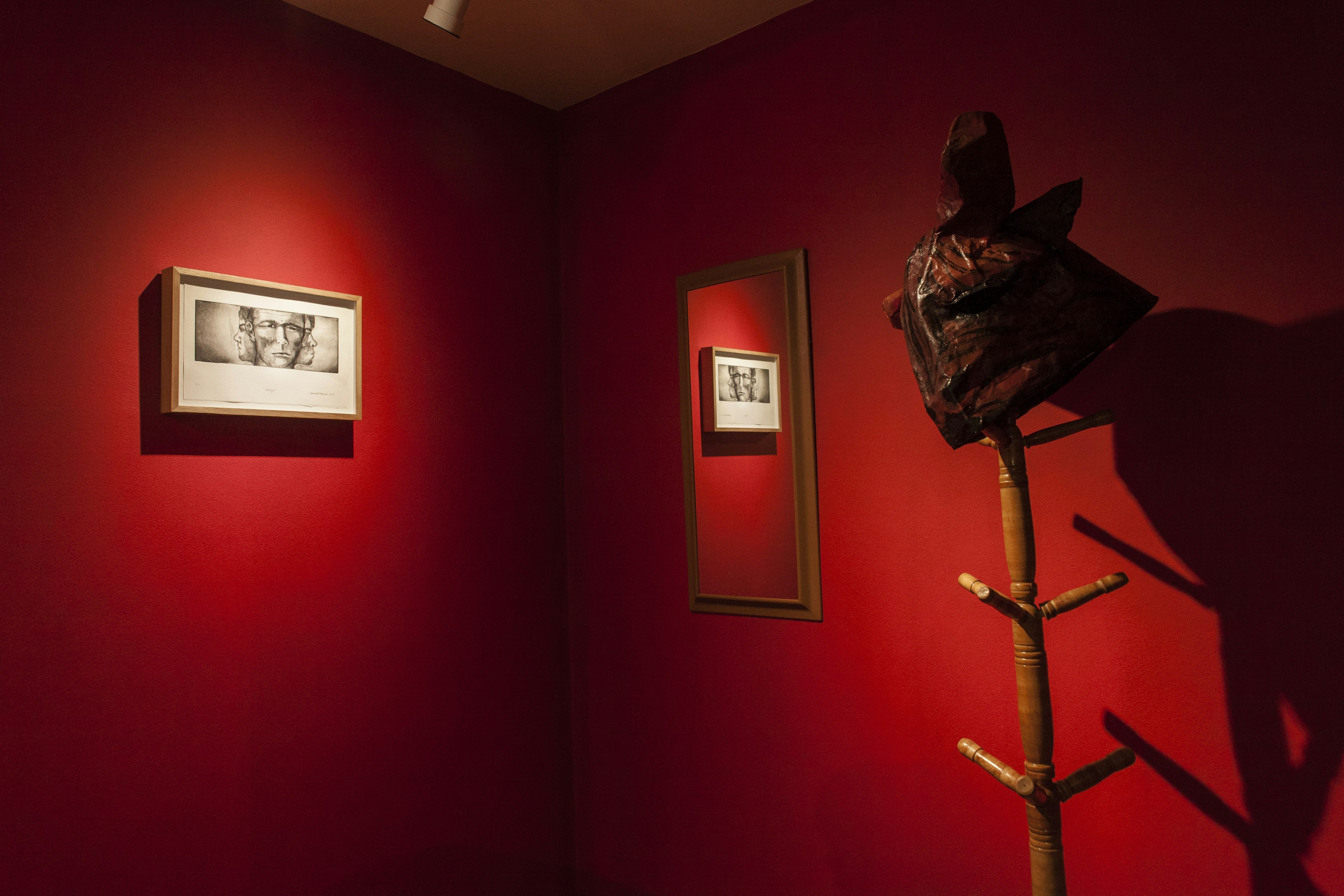 Nas obras em exposição, a artista mistura símbolos do mito com o autorretrato, o autorretrato com a máscara, a máscara com a carne. Projeta-se na obra de forma que sejam apagadas as fronteiras entre o interno da máscara e o externo da vista.